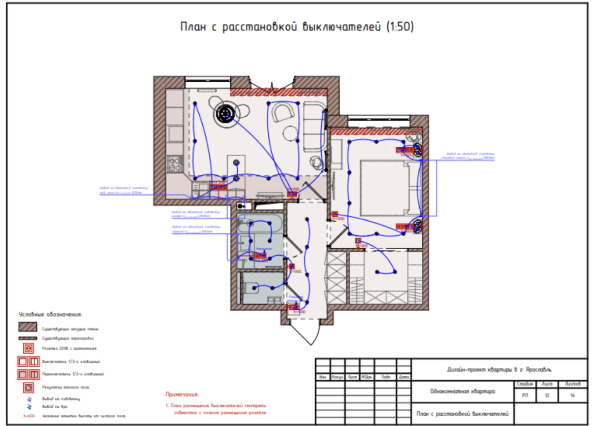 План с расстановкой выключателей подготовила Александра Брицкая на курсе ArchiCad для дизайнеров интерьера.