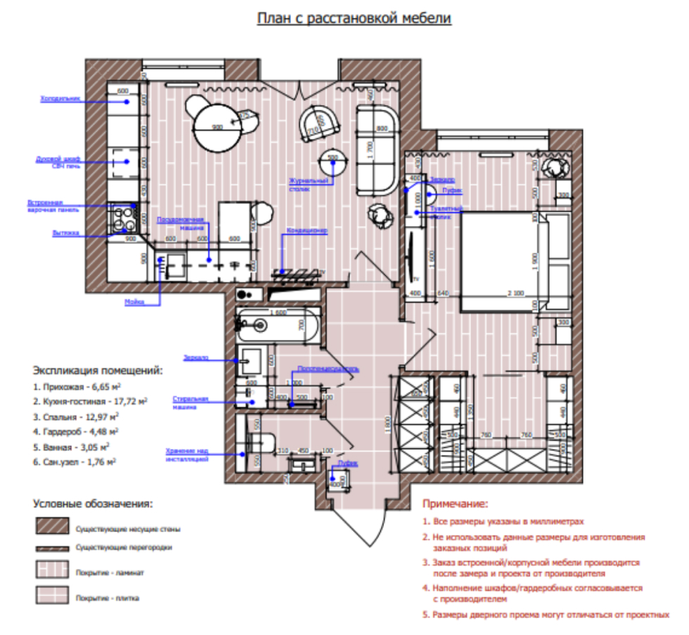 План с расстановкой мебели, выполненный Александрой Брицкой на курсе ArchiCad для дизайнеров интерьера.